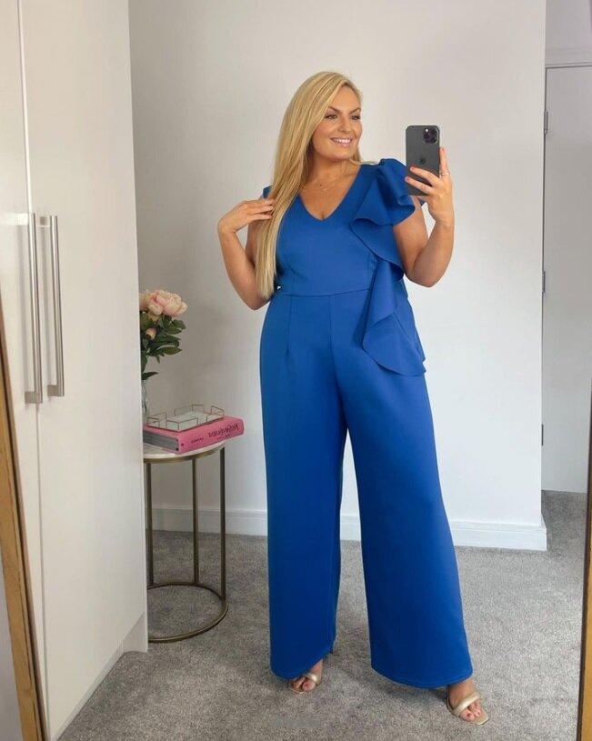 Необычный комбинезон из плотной костюмной ткани выгодно сидит на любой фигуре, но на пышной – особенно выигрышно. Модная отлетная деталь в виде волана на одном плече сделает ваш образ запоминающимся, а высокие каблуки придадут ногам длины, а фигуре стати.