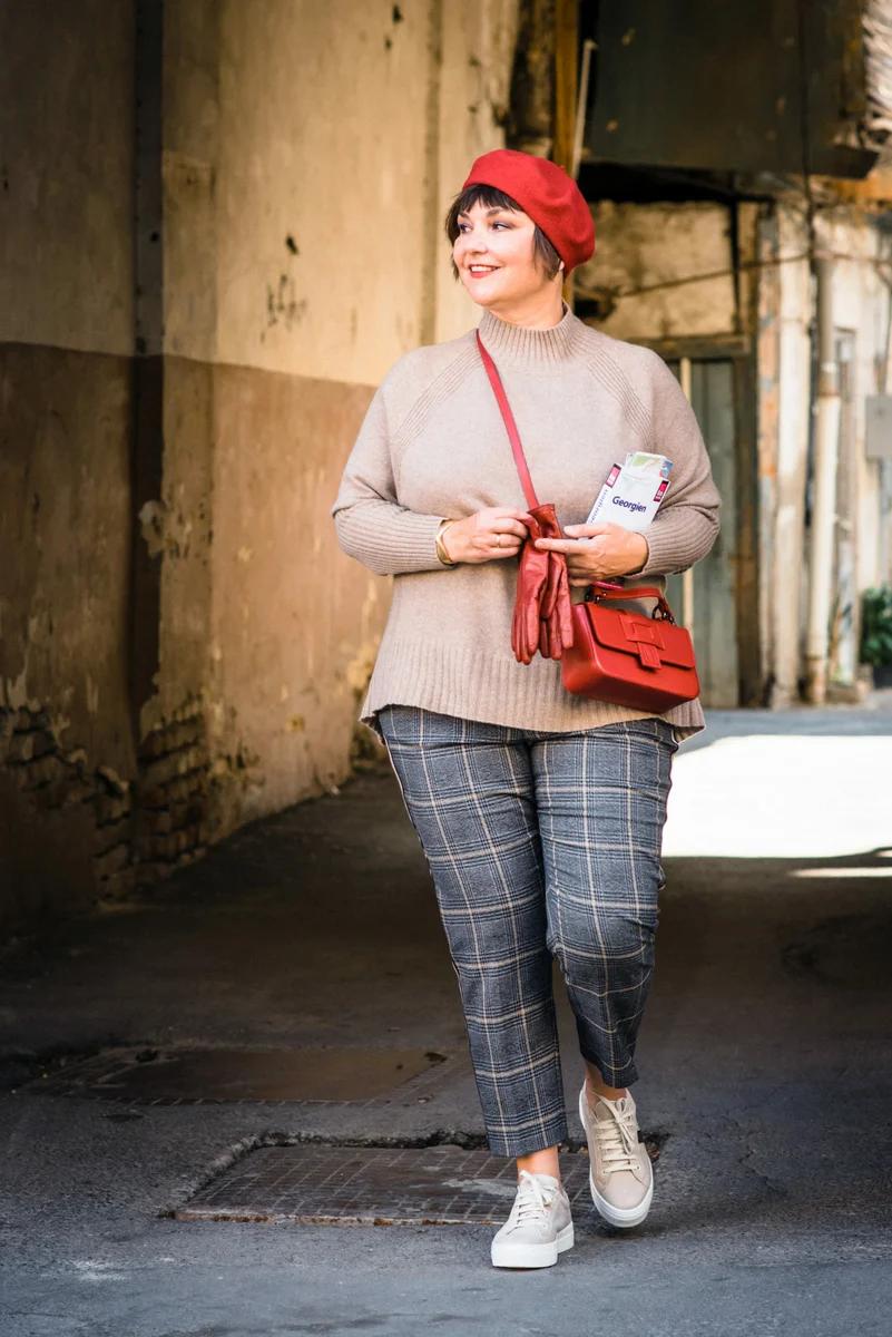 Простой образ со свитером и клетчатыми брюками для обычной жизни выглядел бы просто, если бы не аксессуары в одной красной гамме. Удобная, но стильная обувь также важна в этом образе для ранней осени.