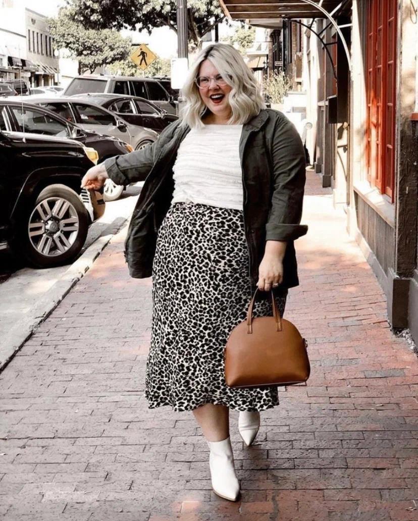 Актуальный анималистический принт не сдает модных позиций и особенно хорошо смотрится в образе с юбкой. Модель силуэта юбки – трапеция, и она особенно хорошо подходит для изгибов пышной фигуры. Пусть все остальные детали образа будут однотонными в базовой цветовой гамме.