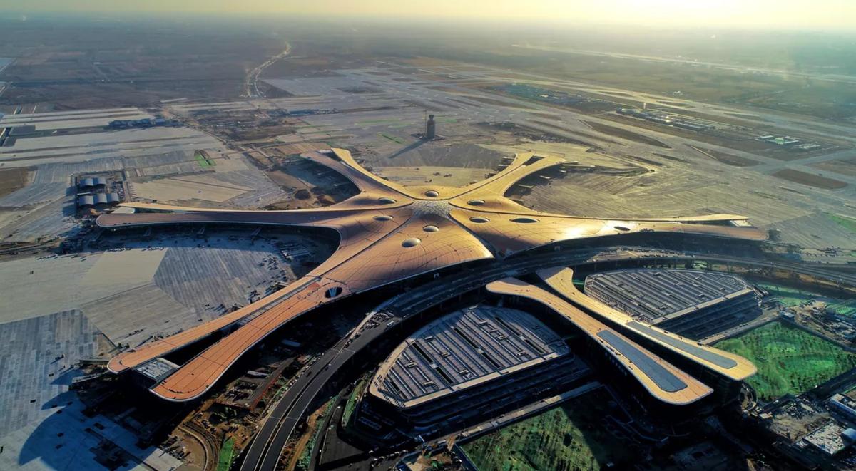 Аэропорт будущего в форме морской звезды. Пропускная способность — 100 млн пассажиров в год. Терминалы украшены элементами китайской культуры, включая символику шелка и чая.