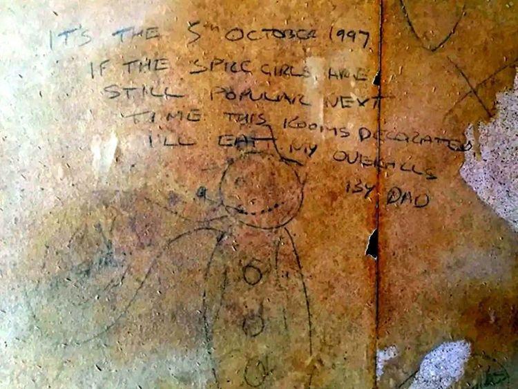 Сообщение под обоями гласит, что его автор съест комбинезон, если при очередном ремонте этой стены Spice Girls будут в трендах. Ему повезло – за 20 лет все изменилось.