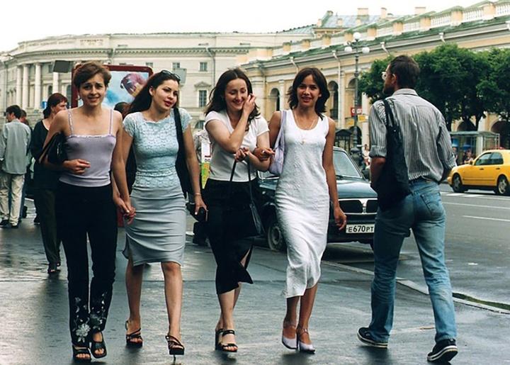 Девушки прогуливаются по Невскому проспекту, Санкт-Петербург, 2000 год. Хорошие, модные, радостно разговаривая о чем-то своём, они улыбнулись фотографу и это веселье передается и нам.