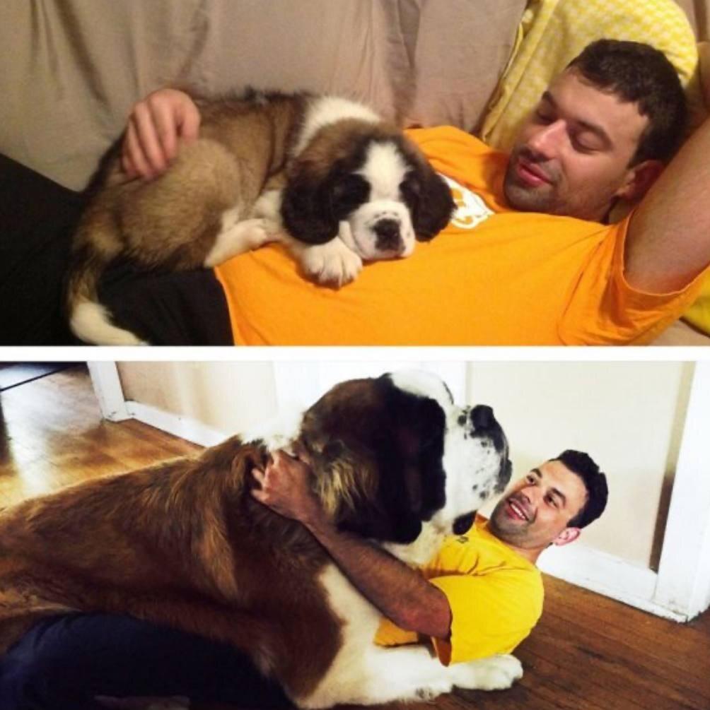 На данном фото мы видим мужчину со своим псом, когда он был ещё щенком и уже взрослой собакой.