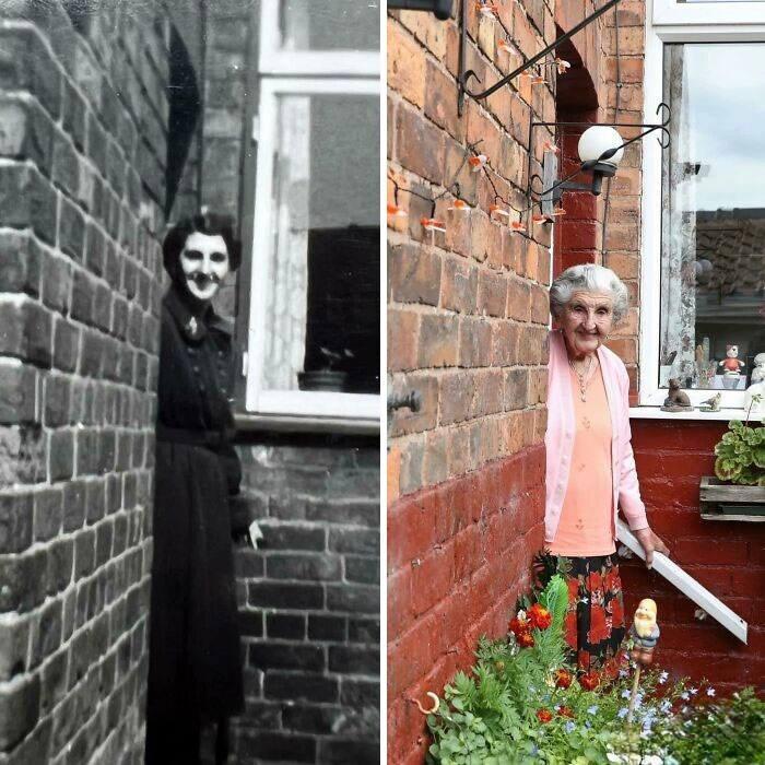 Мама с дочкой решили повторить фотографию 1940 года, где их прабабушка со своей сестрой сидят на крыльце своего дома. Новое фото уже было сделано в 2022 году.