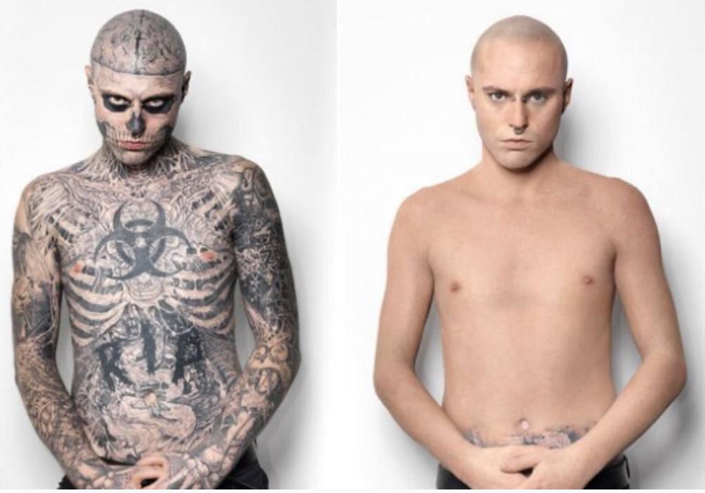 На фото вы видите Рика Дженеса по кличке «Парень зомби». Слева — как он выглядит сейчас, а справа — тату, замазанное тональным кремом. Можно сравнить его с тем, как бы он выглядел без татуировок. Как он вам нравится больше?