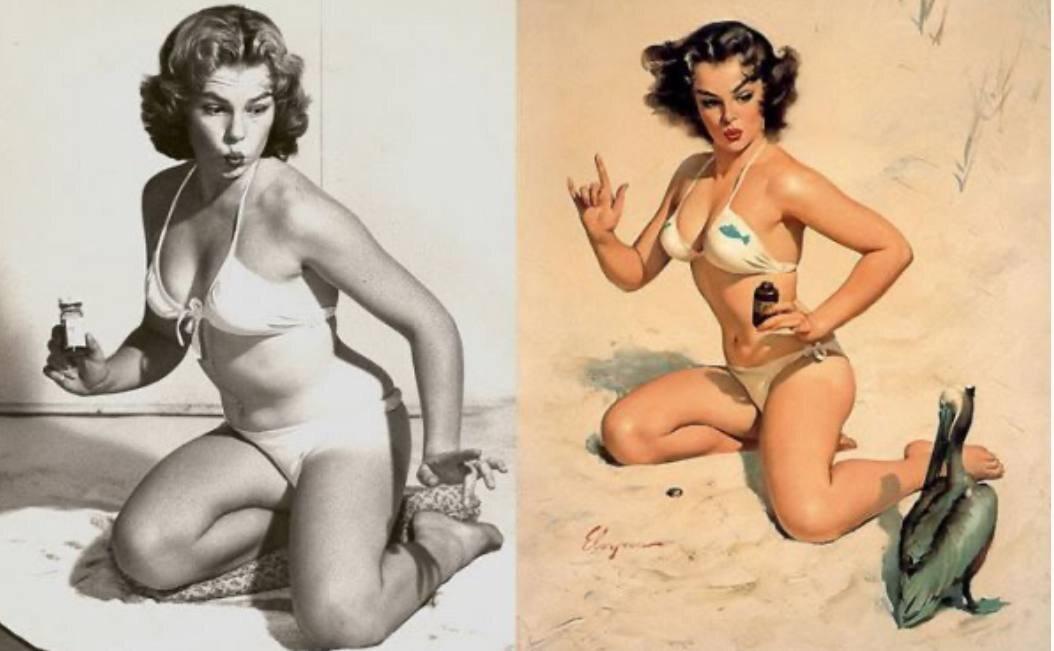 Пин-ап-модель на фото слева. Справа — она же, но уже на отредактированном рисунке, где учтены и убраны все её недостатки и лишние детали.