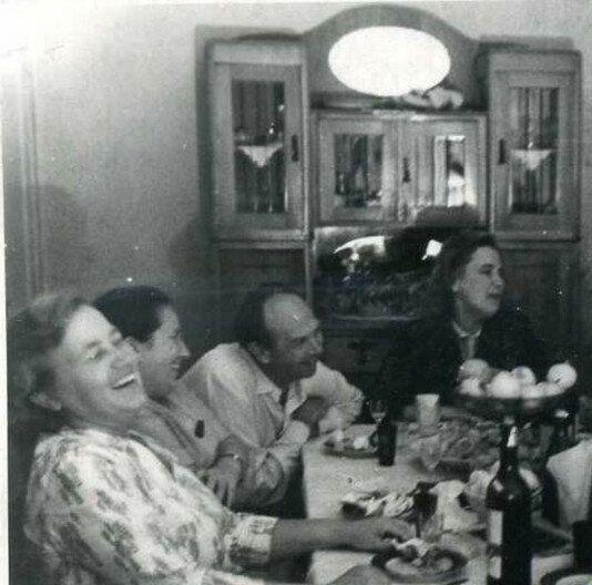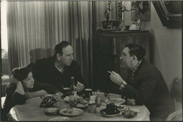 А это — застолье обычной советской семьи. Стол практически ничем не отличается от того, что в редакции «Юности», а по сравнению с Никулиным и Пляттом это застолье даже выглядит побогаче. Но главное что бросается в глаза, это, конечно — искренние улыбки и смех. Такое не сыграешь на фотокамеру.