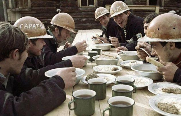 Строители БАМа на обеде. В меню — суп, картофельное пюре с котлетой, компот, хлеб. Скромно, просто, сытно. После тяжелой работы, да на свежем воздухе — такой обед казался чрезвычайно вкусным и уходил на ура.