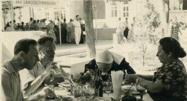 Каждый трудящийся в СССР имел право на отдых в санатории. Путевки выдавали всем и, что интересно, далеко не все спешили ими воспользоваться. Вот семья обедает под открытым небом в санатории в Гаграх.