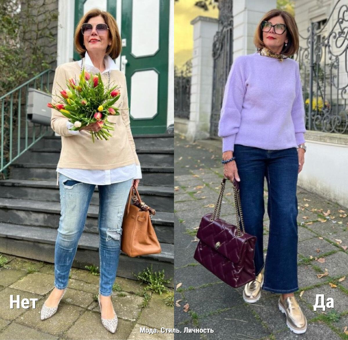 Возможно, одна из самых распространенных ошибок, которую делают женщины за 50, – это неправильно подобранный силуэт одежды. Слишком обтягивающие вещи могут негативно сказаться на пропорциях фигуры. Скинни коварны тем, что визуально расширяют бедра, особенно, если икры и щиколотки узкие. Если бедра у вас и так заметны в любой одежде, лучше выбрать более прямые модели джинсов.