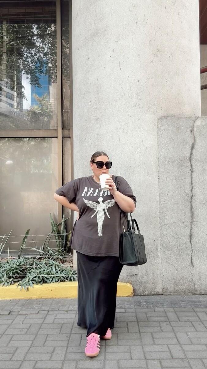 Очевидно, что пышку юбка-макси и оверсайз футболка делают еще крупнее, но тренды и социальное одобрение для неё важнее здравого смысла