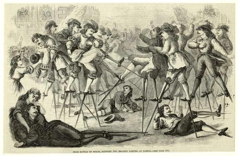 См.п.1. Да, есть несколько средневековых изображений людей на ходулях — но если приглядеться, это или цирковые персонажи, или участники турниров и потешных боев, или крестьяне.