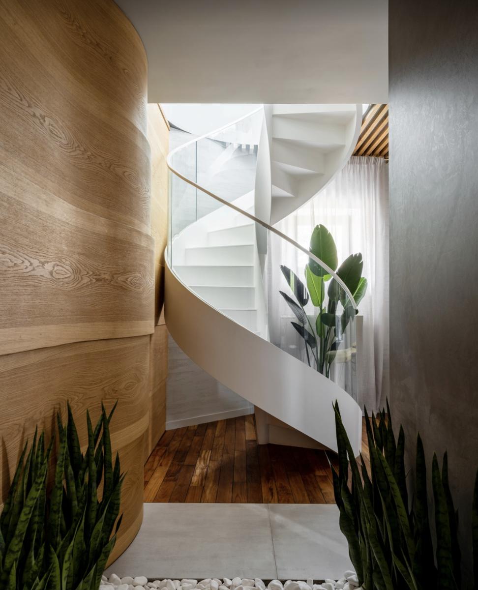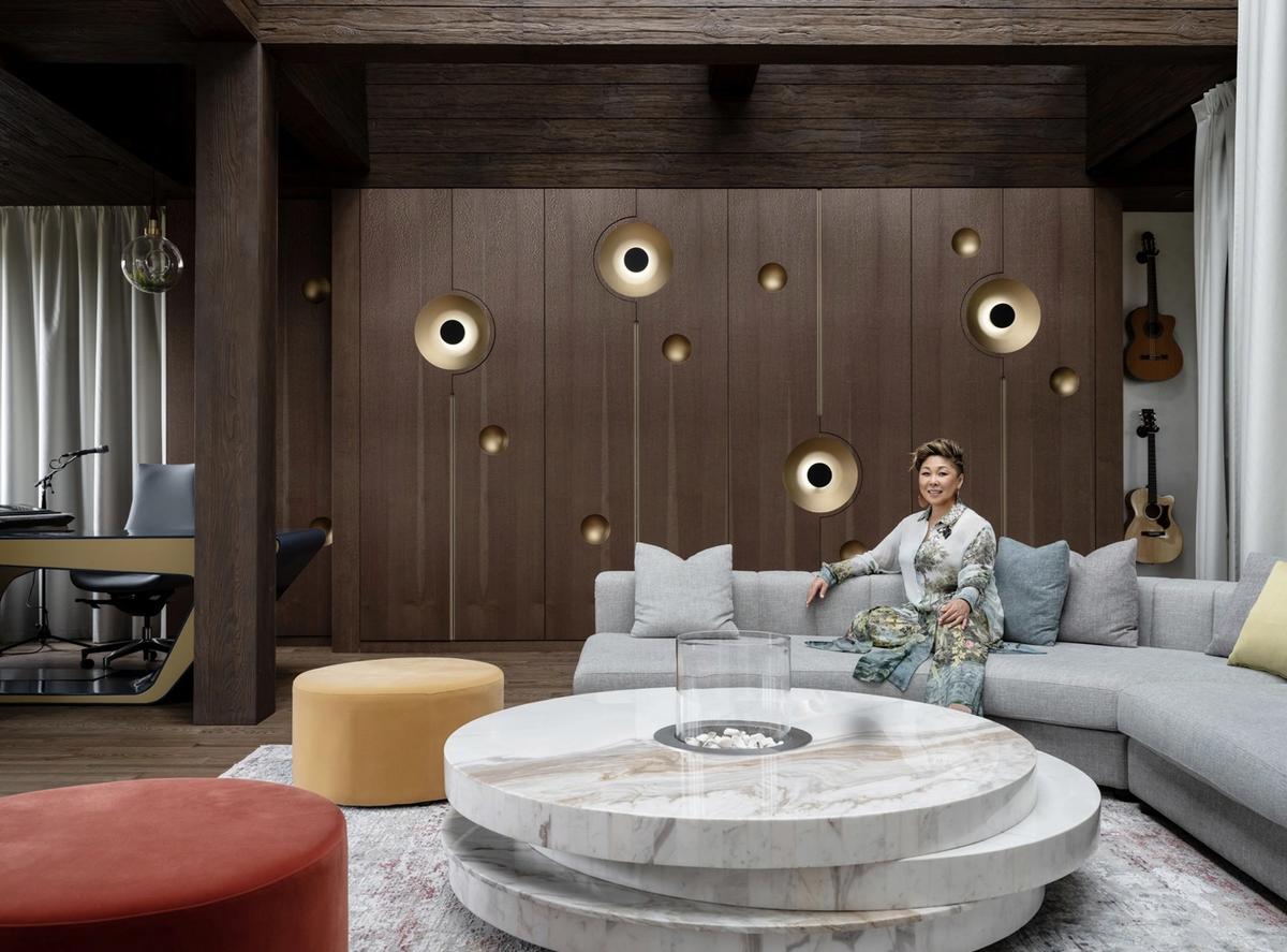 Как только вы входите в дом Аниты Цой, вас встречает элегантная парадная лестница и уникальная спиралевидная люстра. Она словно изображает птиц, взмывающих в небо, создавая ощущение легкости и света. Люстра отражается в позолоченном потолочном элементе, что добавляет мягкости освещению, особенно в зимние месяцы.