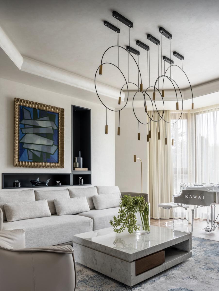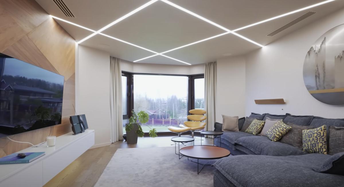 Кроме музыкальных инструментов, гостиная выделяется продуманным дизайном. Мягкая мебель с тонкими ножками добавляет легкости интерьеру, а «парящий» телевизор над стильной темно-серой тумбой – современный акцент. Ещё одна изюминка – осветительные приборы в виде облаков, которые перекликаются с люстрой в холле.
