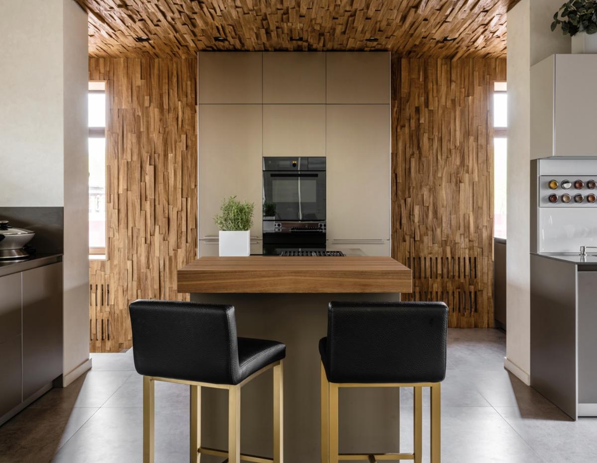 В центре кухни расположен кухонный остров, который объединяет рабочую и обеденную зоны. Здесь можно одновременно готовить и общаться с гостями за чашечкой кофе. Варочная панель и духовой шкаф – современные устройства, способные готовить блюда практически без участия человека.