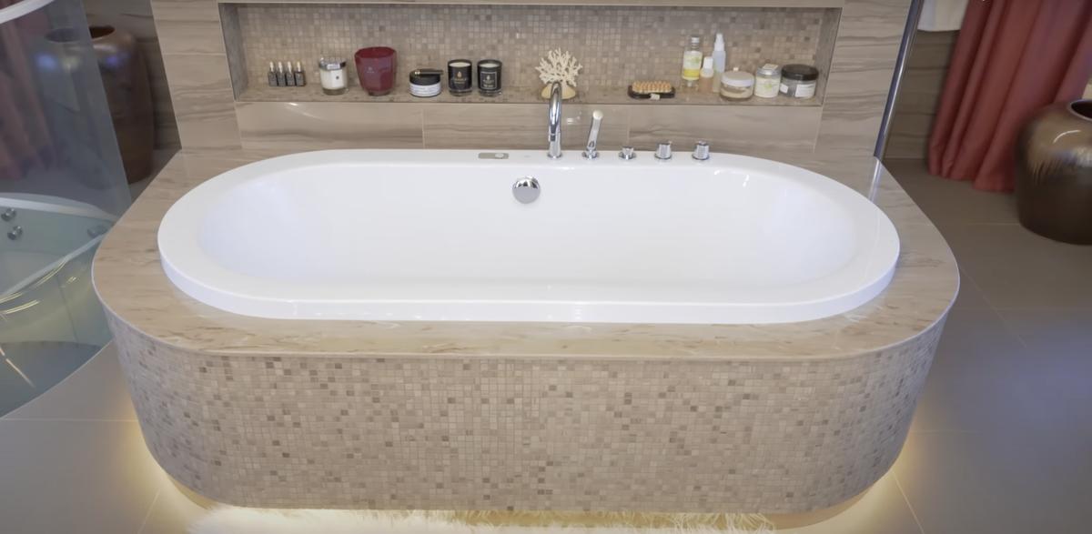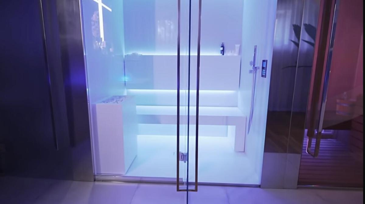 На первом этаже дома расположена личная спа-зона Аниты. Здесь есть всё для полного релакса – инфракрасная сауна, тропический душ и просторная ванная. Особое внимание привлекает освещение: сочетание естественного света из небольших окон и встроенных светильников создаёт атмосферу спокойствия.