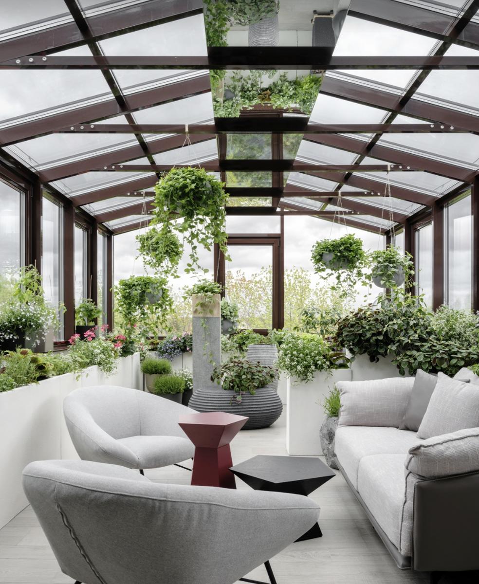 Растения здесь подобраны так, чтобы радовать круглый год: от декоративных кустарников до тропических цветов. В зимнем саду семья часто собирается для вечерних посиделок или просто наслаждается уединением и тишиной.