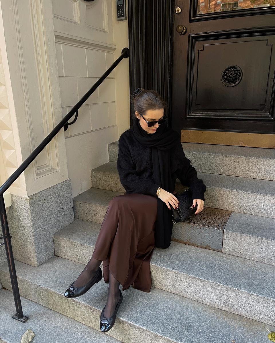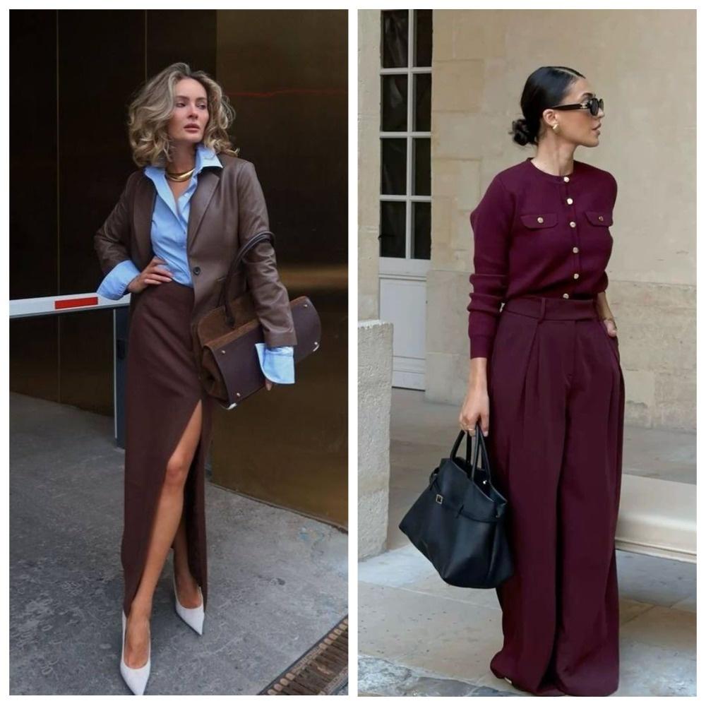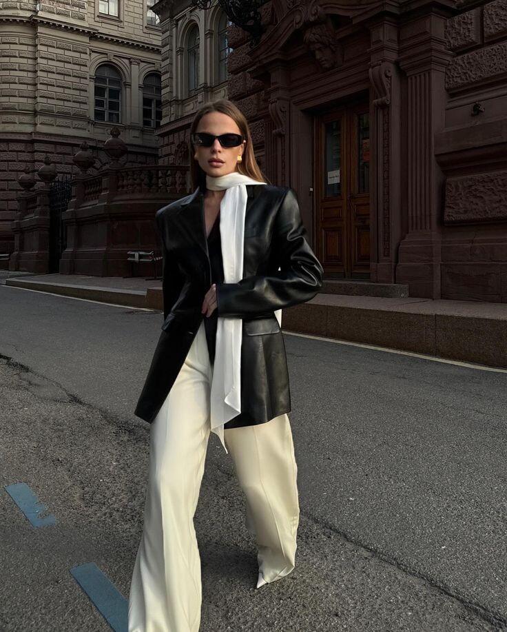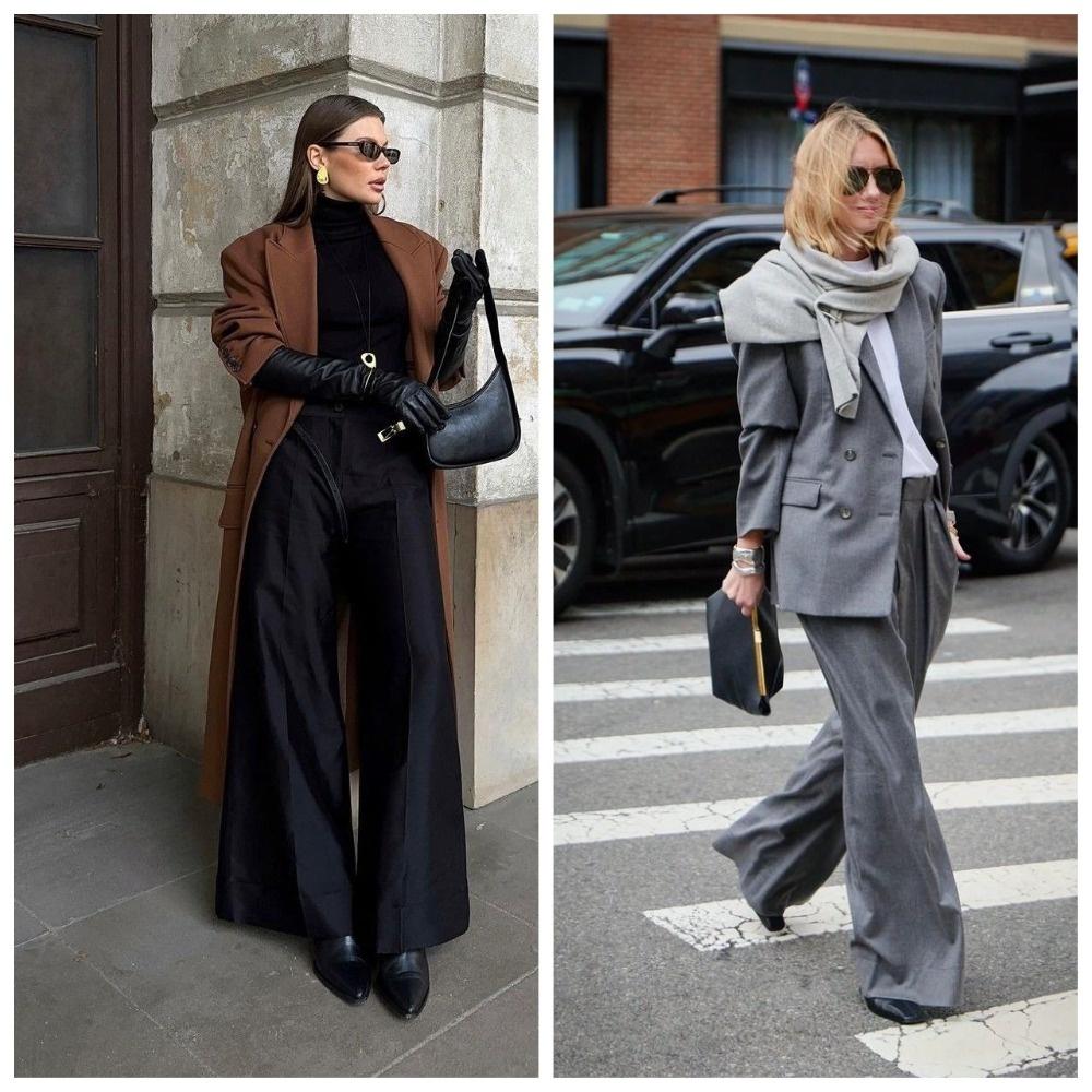 Можно внедрить отдельные элементы и скомбинировать их с трендами. Например, надеть брюки палаццо, а сверху — модный свитер на одно плечо. За счёт классического кроя брюк сразу выглядишь статуснее, а стильный верх не даёт скатиться в излишний официоз.