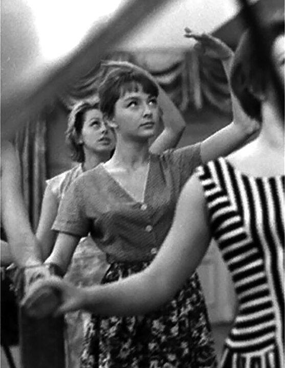 Прекрасная Анастасия Вертинская на уроке пластики в Высшем театральном училище имени Б. В. Щукина в 1964 году. Совершенно очаровательная в этом простом одеянии.