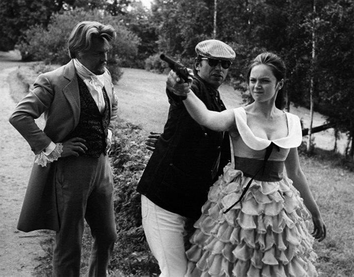 Режиссер Андрей Михалков-Кончаловский с актерами Ириной Купченко и Леонидом Кулагиным на съемках фильма «Дворянское гнездо» в 1968 году. Это была первая роль Ирины Купченко, видно, как неловко она держит пистолет. После этого фильма, актриса проснулась знаменитой.