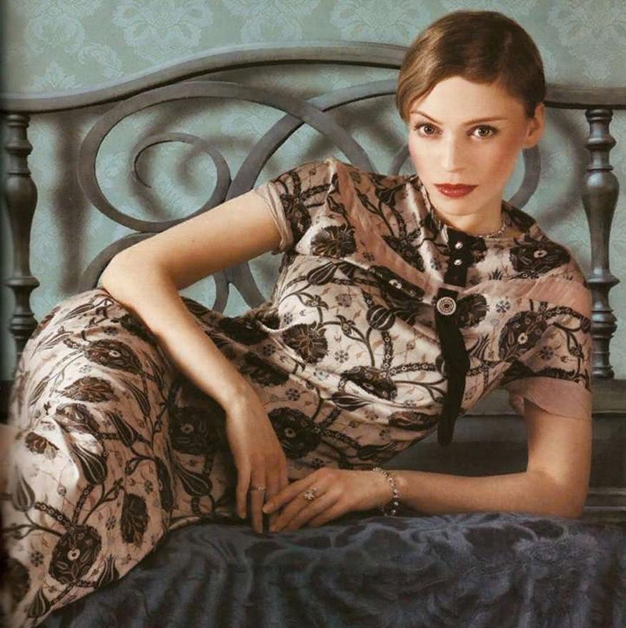 Актрисе подходят плавные линии с некой роскошью. Например, можно попробовать представить её в стиле Модерн с текучими контурами, с доминантой глубокого голубого и серого. Глубина и некая дымка подчеркнули бы её достоинства и произвели бы нужный эффект.