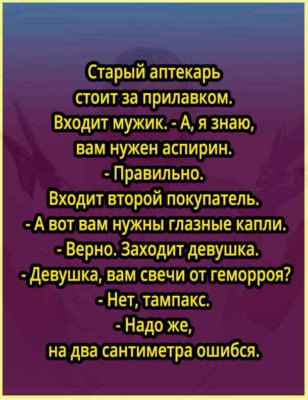 Главная » Развлекательное Анекдоты, сборник. Для поднятия настроения и юмора. Сегодня подобрала вам немного анекдотов, чтобы добавить улыбок и поднять настроение. Даже опытный аптекарь может немного, самую малость ошибиться.