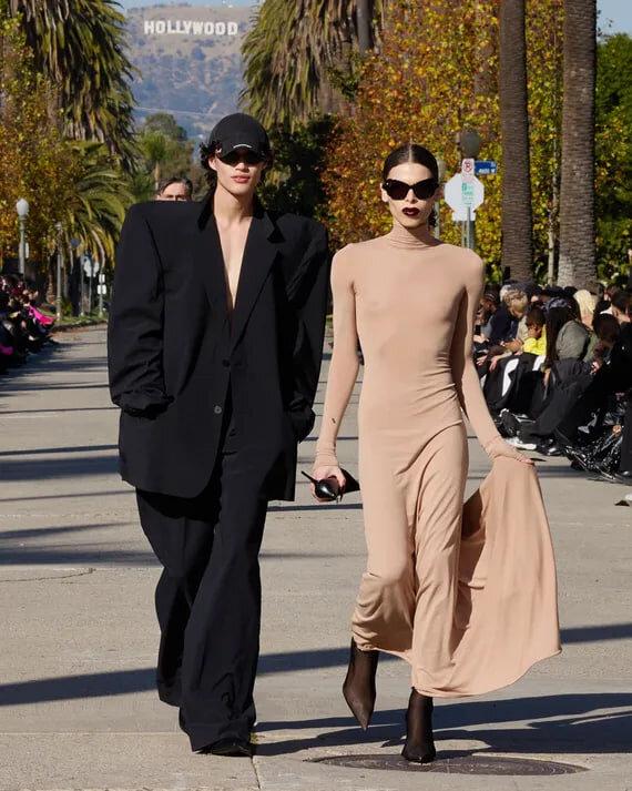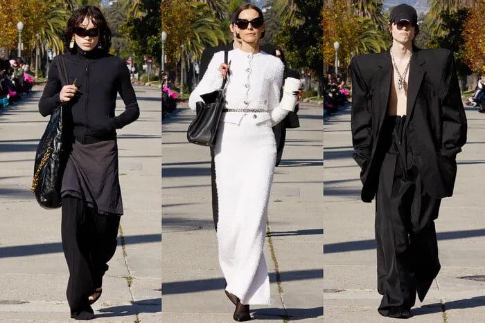 Тревожная темнота последнего шоу Balenciaga зависела от света, то есть от яркого солнечного света Лос-Анджелеса. “Я не смог бы создать коллекцию [подобную этой] в Нью-Йорке”, — сказал креативный директор Демн. “И я не смог бы показать ее в Париже. Речь шла о том, что приходит отсюда”. Balenciaga первоначально планировала провести свое шоу в субботу вечером, но благоразумно перенесла его на начало дня, расположившись на обсаженной пальмами улице в элегантном парке Хэнкок с видом на вывеску Голливуда вдалеке, как на открытке.