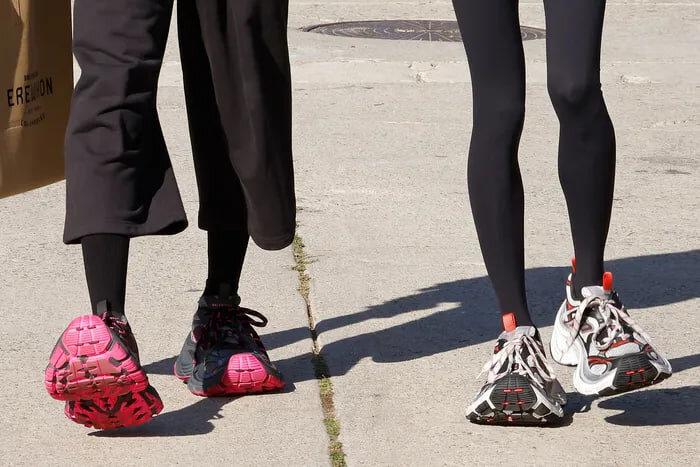 Лоик Гомес, музыкант и композитор, профессионально известный как BFRND, и женатый на Демне, сочинил громкий саундтрек, намекающий на местную одержимость оздоровлением. Это, соответственно, ударило, как молотком по гвоздю. Как сказал Демна об интенсивном звуке: “Это большая звуковая составляющая пребывания в Лос-Анджелесе, как будто стоишь в пробке, а реклама по радио нескончаема”. Думайте о кроссовках как о символе этой чрезмерности.