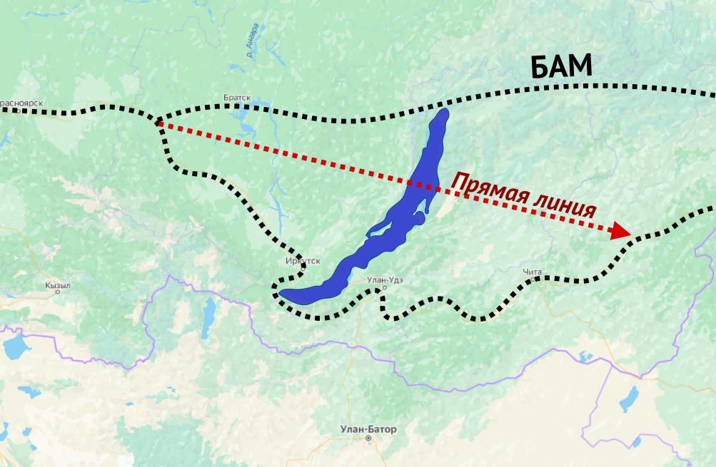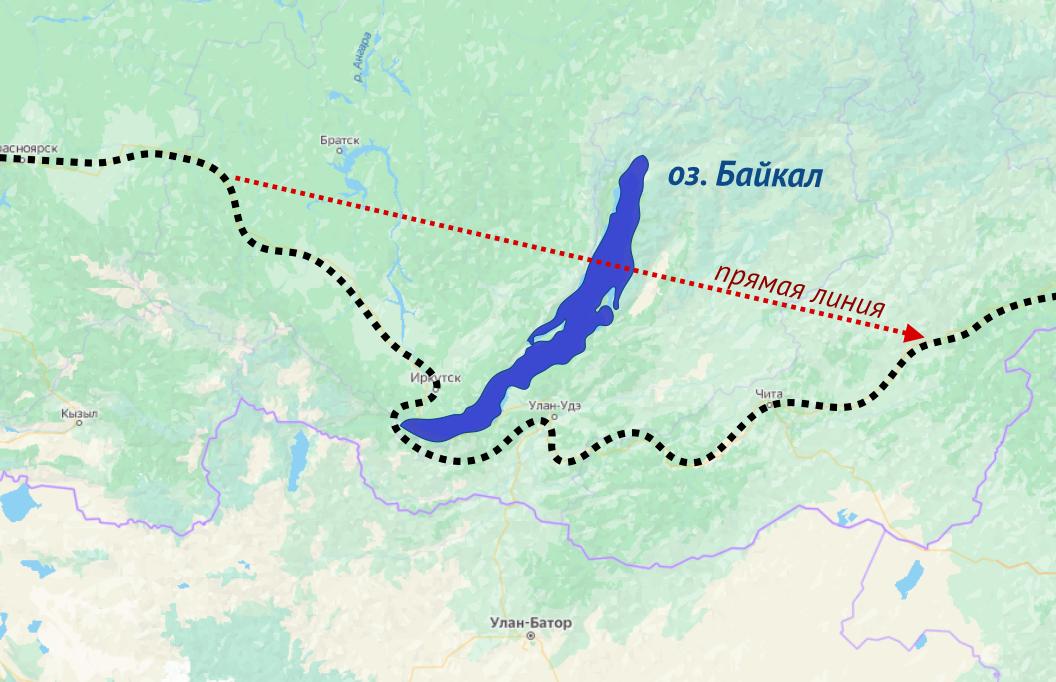 Остается «старый дедовский метод» преодоления препятствий – в обход. Изначально (еще с царских времен) железные и автомобильные дороги строили с южной стороны озера. Получался вот такой крюк: