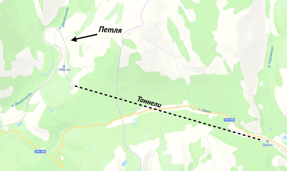 Кстати, интересный факт. Сразу на выходе из тоннелей (или перед входом, смотря как смотреть) видна мощная петля длинной несколько километров: