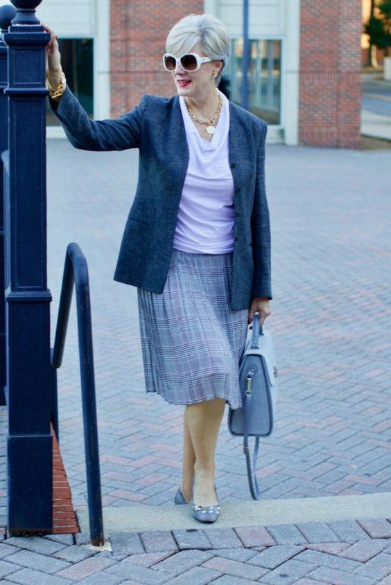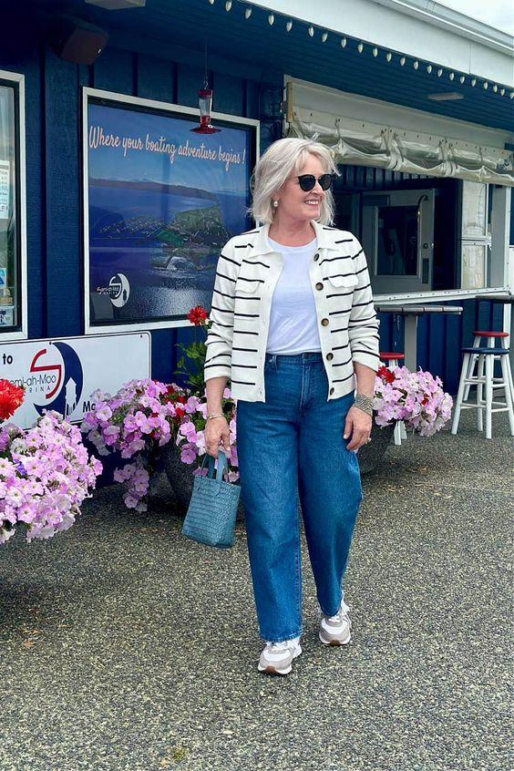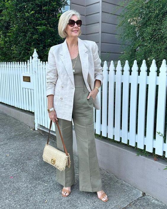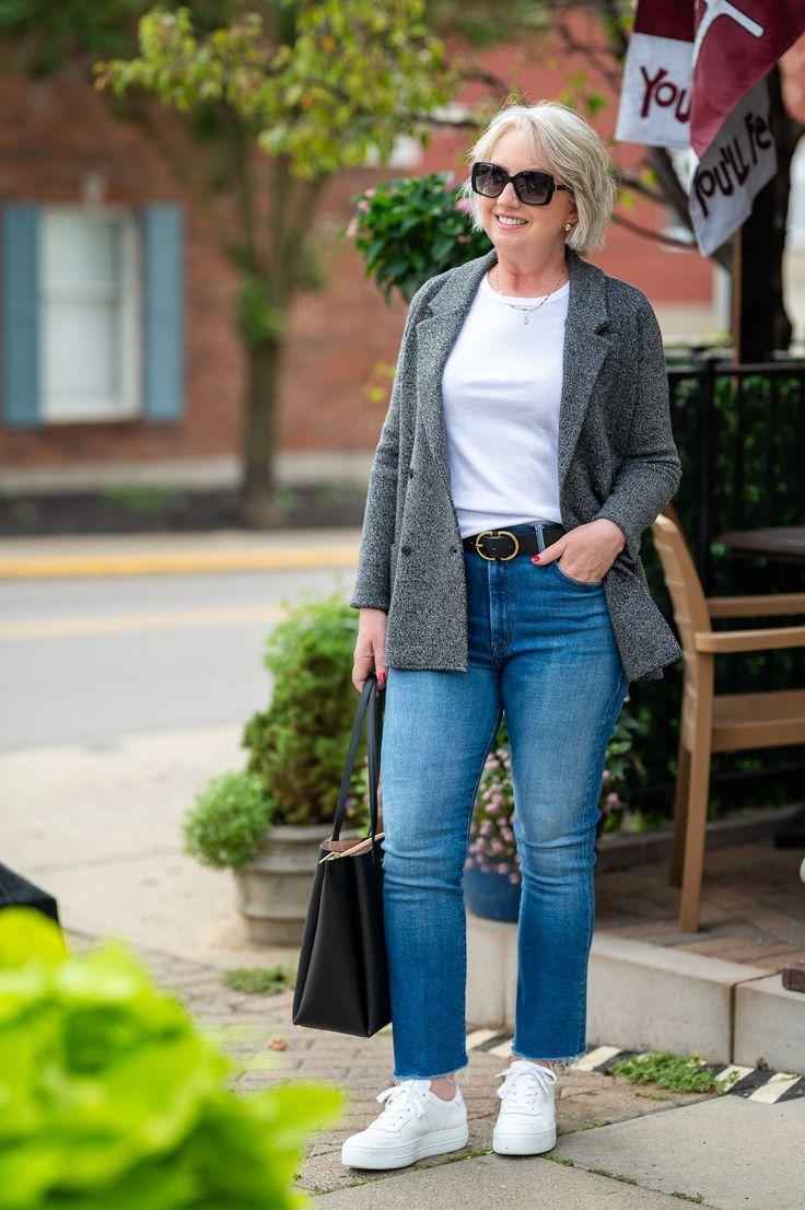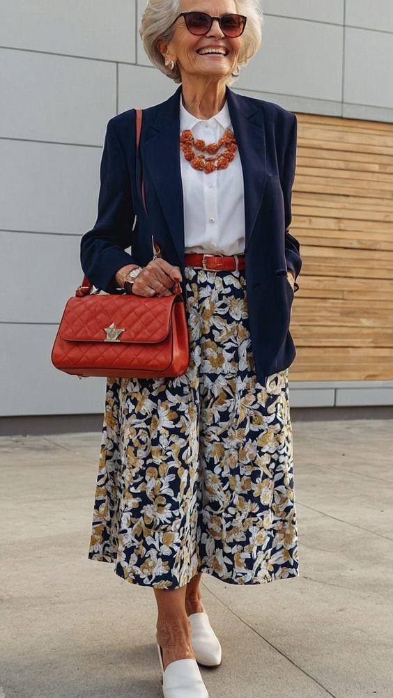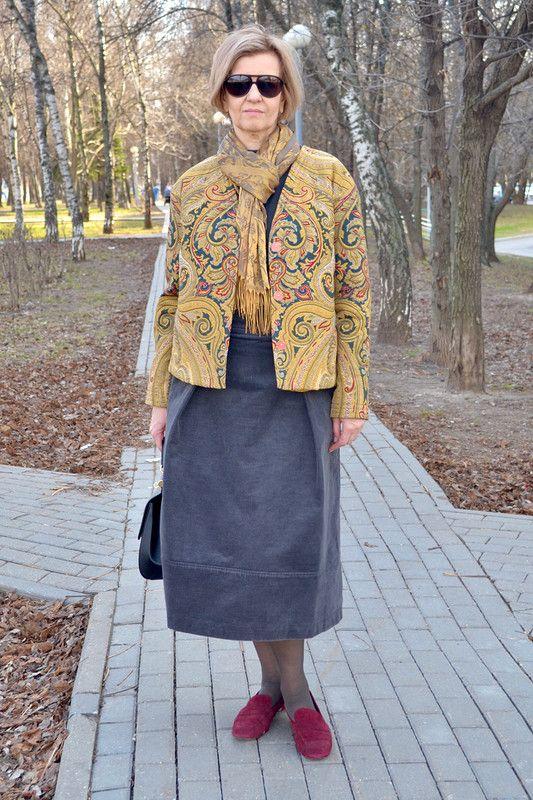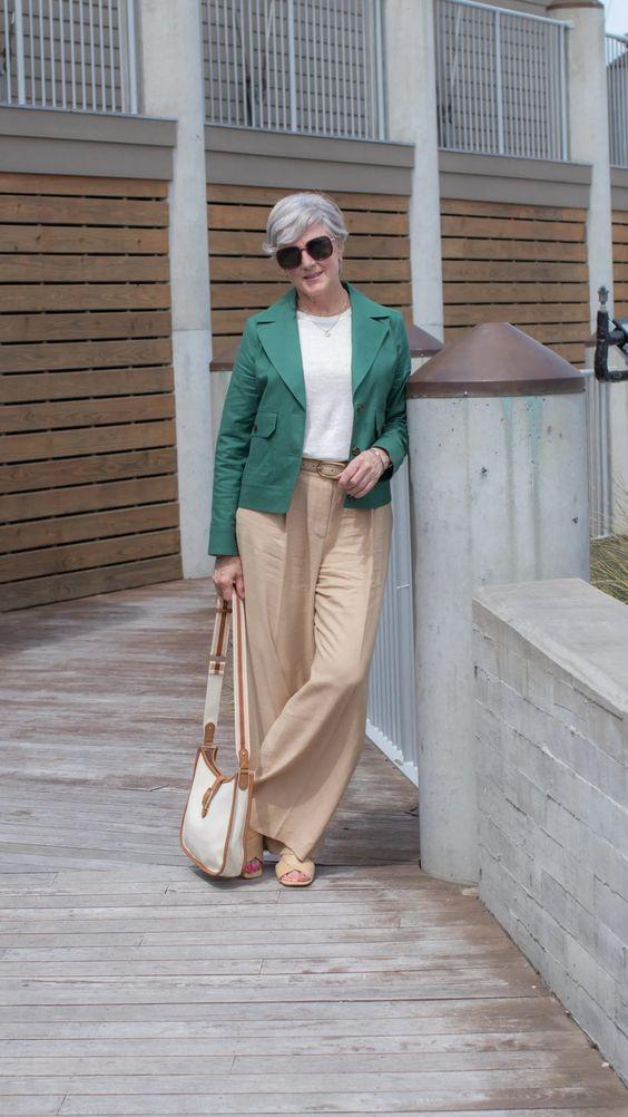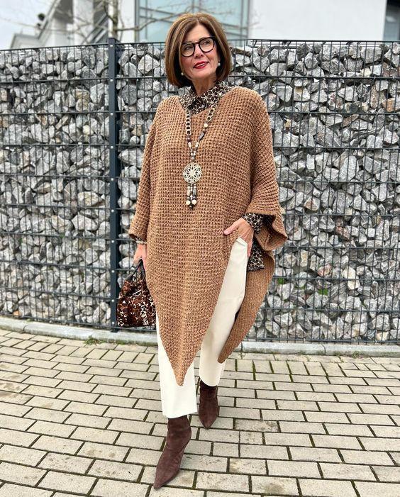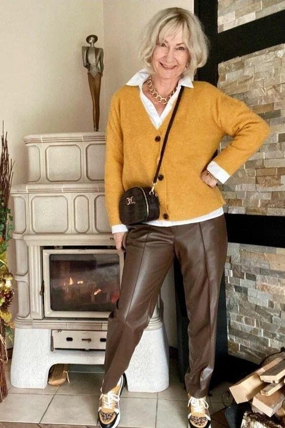 1. Коричневые кожаные брюки, белоснежная классическая рубашка и горчично-желтый кардиган, а также маленькая черная сумочка и стильные кроссовки в черно-желтый леопардовый принт. В этом повседневном образе идеально все – и выбор в пользу брюк, и сочетание фактур, и гармония цветов, и визуальная стройность, которую он дарит даме за 60.