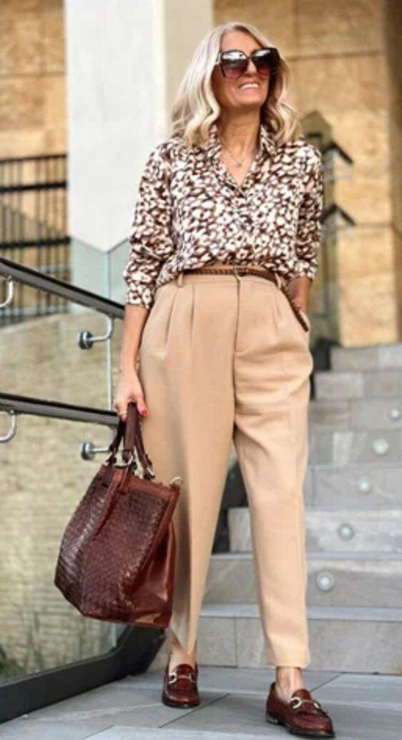 2. Классические, чуть зауженные к низу брюки, бело-коричневая блузка с пестрым принтом и акцентные коричневые детали – тонкий ремешок, большая сумка, лоферы – это составляющие стильного делового образа, который подчеркивает фигуру женщины и неброскими тонами все же привлекает к ней внимание. Это именно тот тип классики, где подходят только брюки.