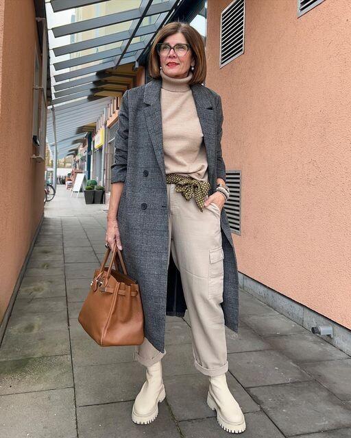 3. Бледно-бежевые брюки-карго, подвернутые на щиколотках, дополненные песочно-бежевой водолазкой и длинным темно-серым пальто составляют образ стильный и элегантный. В нем нельзя заменить брюки на юбку, ведь в образе гармонично сочетаются все детали, даже контрастный и на первый взгляд кажущийся посторонним платок в горошек, пропущенный в шлевки брюк и завязанный бантиком.