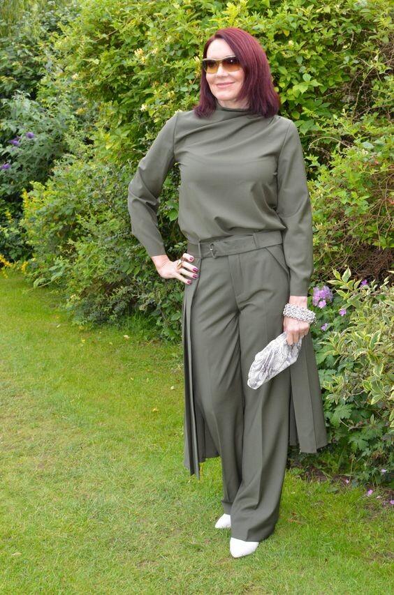 4. Темно-зеленый костюм, состоящий из водолазки и брюк с небольшим дополнением-юбкой, выглядит очень оригинально и идеально подходит для тех женщин, которые не могут определиться – надеть юбку или брюки? В этом наряде эффектно сочетаются оба варианта – классические длинные брюки со стрелками и юбка-плиссе. По крайней мере, та часть, что располагается сзади.