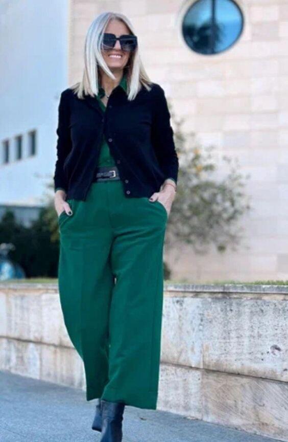5. Широкие зеленые брюки-палаццо выглядят почти как юбка макси, только еще лучше. Свободные, дополненные зеленой рубашкой, подчеркнутые черным широким ремнем и укороченным черным же кардиганом, такие брюки позволяют создать образ элегантный и стильный. И не только повседневный – для торжественных мероприятий такой наряд тоже отлично подойдет.