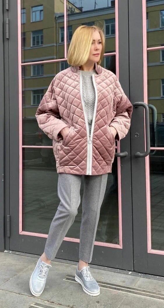 6. Легкий и теплый трикотажный ансамбль в серо-жемчужной цветовой гамме, составленный из узких брюк со стрелками и вязанного свитера – и никаких юбок, ведь они не способны подарить ощущения настоящего уюта в прохладные осенние дни. Серые кеды на высокой платформе гармонично вписывают в общую гамму и завершают образ, а пудровая куртка-пуховик его эффектно оттеняет.