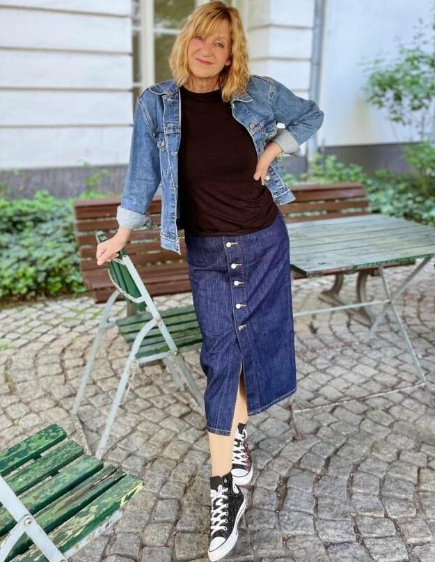 7. А вот для создания противоречивого и все же гармоничного образа с вещами из денима как раз стоит выбрать юбку. Модель темно-синего цвета длиной чуть ниже колен, на пуговицах, смотрится стильно и свежо. И это впечатление поддерживает темно-коричневая базовая футболка и светло-синяя джинсовая куртка с подвернутыми рукавами. А за противоречивость отвечают классические черные кеды.