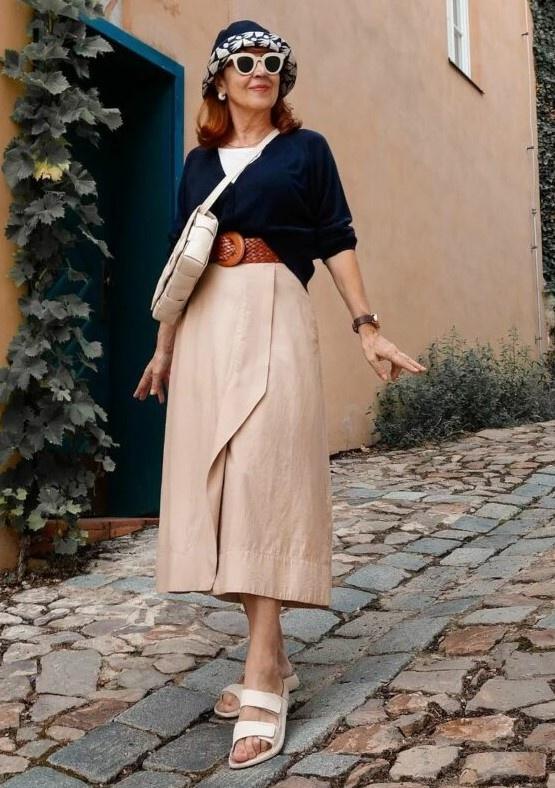 8. При создании женственного и романтичного образа без юбки, естественно не обойтись. Особенно без такой – длинной, песочно-бежевой модели на запах, с высокой посадкой, украшенной широким коричневым плетенным поясом с крупной пряжкой. Юбку можно дополнить белым топом и черной рубашкой, полы которой заправить за пояс.