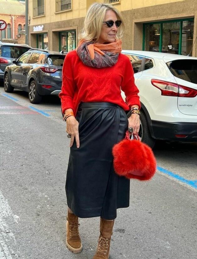 9. Яркость и эпатаж – это сочетание черного и красного, кожи и трикотажа. Черная кожаная юбка-миди на запах в сочетании с уютным тонким красным джемпером, дополненные пушистой красной сумочкой создают образ контрастный и в то же время элегантный, а также очень женственный, несмотря на тяжелые высокие замшевые ботинки. И основную роль в этом играет именно юбка. Ну и немного – пестрый пышный шарф на шее.