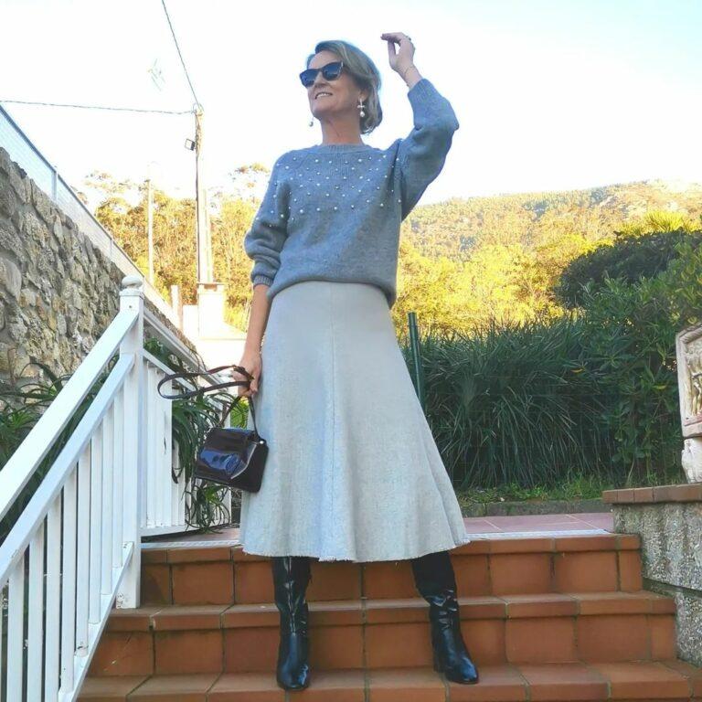 10. И снова о женственности, которую любому образу придает юбка. Длинная белая трикотажная юбка А-силуэта и жемчужный джемпер, украшенный по верхней части переда мелкими жемчужинками, черный сапоги с острыми носами на высоких устойчивых каблуках – все в этом образе подчеркивает фигуру, изящество и красоту женщины. И никакие брюки в аналогичной ситуации справиться с этим не смогут.