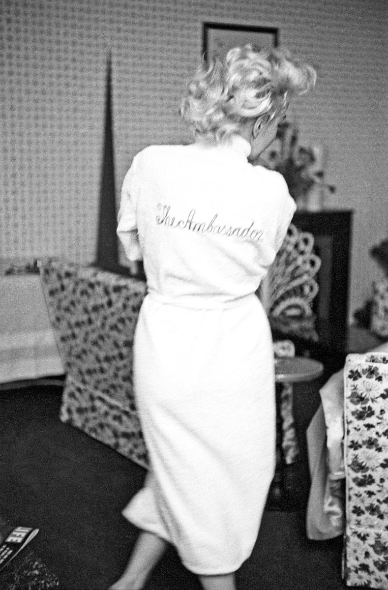 Шелковые пижамы на некоторых снимках контрастируют с обычными гостиничными халатами. Но все это она снимала на ночь, ведь спать актриса предпочитала обнаженной.