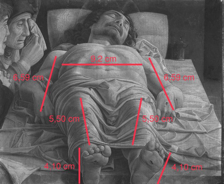 Обратная перспектива выбрана мастером не случайно: если бы Мантенья решил передать реальное соотношение между ступнями и головой, то основное место на холсте заняли бы ноги, что помешало бы восприятию головы Христа.