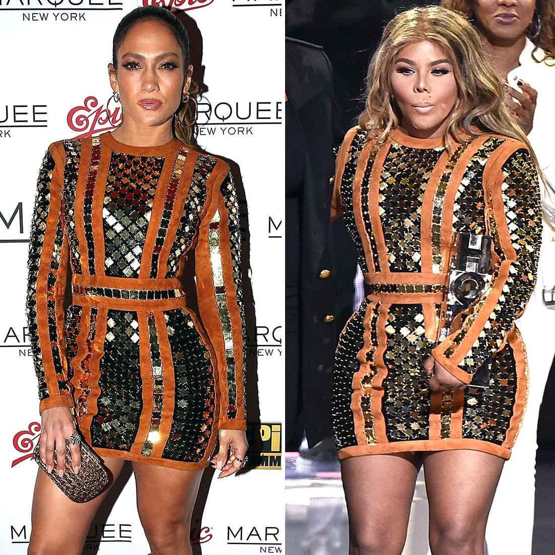Широкоплечая Лил Ким в этом платье Balmain напоминает воительницу в доспехах. А Дженнифер Лопес вновь шикарна!