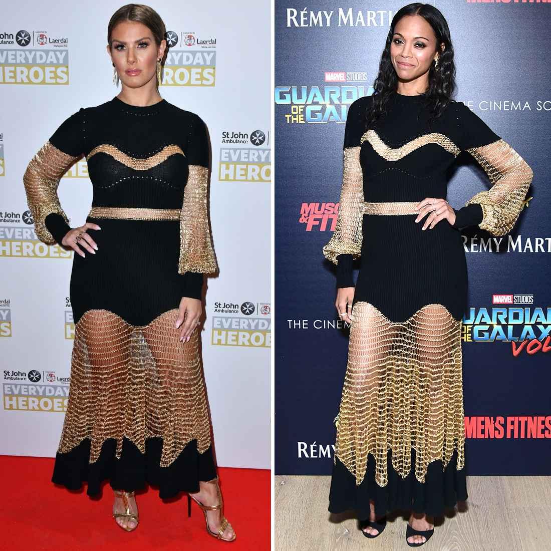 Как известно, черный цвет стройнит, но в случае с Ребекой Варди, надевшей это платье Alexander McQueen, он лишь подчеркнул ее широкие бедра и отсутствие талии. Куда лучше этот наряд сидит на Зои Салдане.
