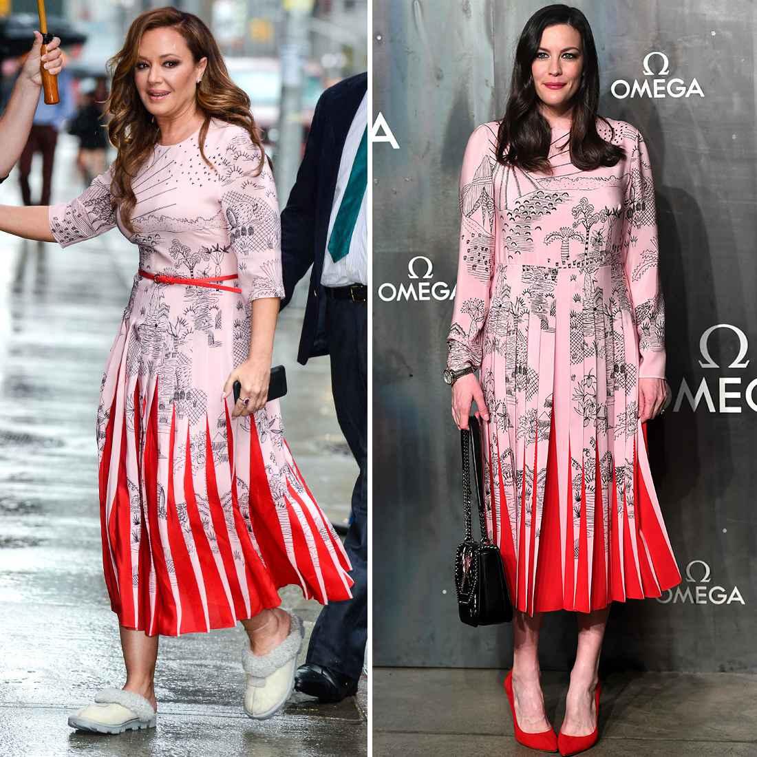 Американская актриса Лиа Ремини была поймана папарацци в неудачный момент, когда вместо туфель на шпильках она была обута в кроксы с меховой опушкой. А вместе с ними это розовое платье Valentino смотрится не так прекрасно, как на Лив Тайлер, дополнившей свой образ красными лодочками.