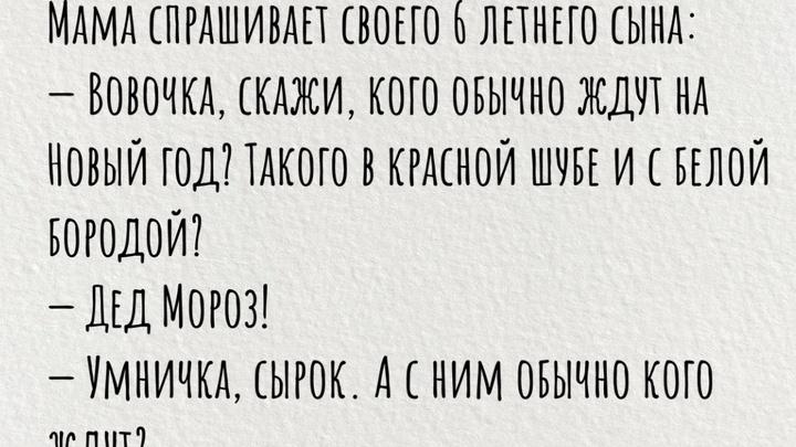 — Вовочка, скажи, кого обычно ждут на Новый год? Такого в красной шубе и с белой бородой?