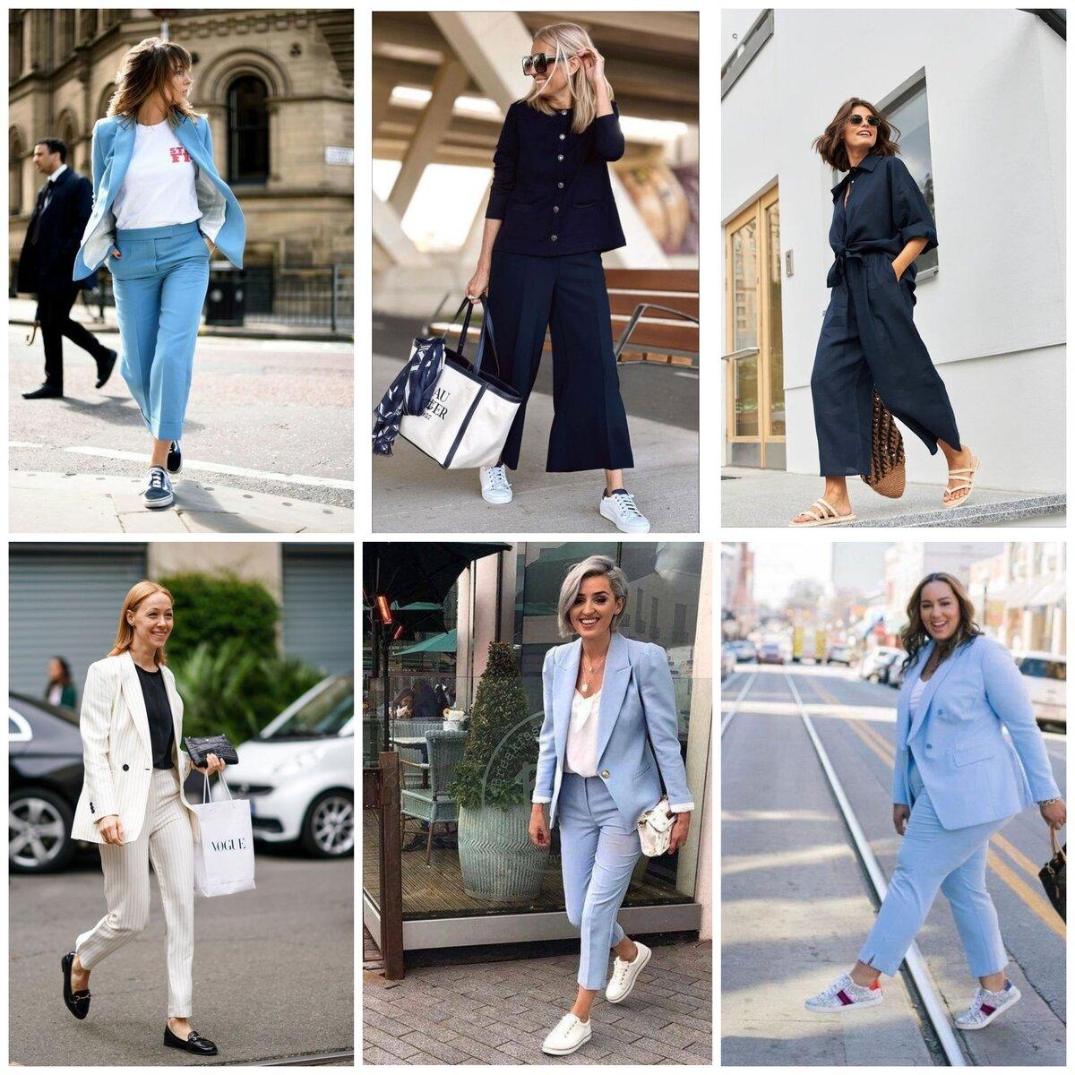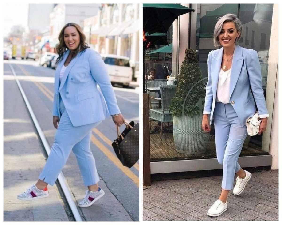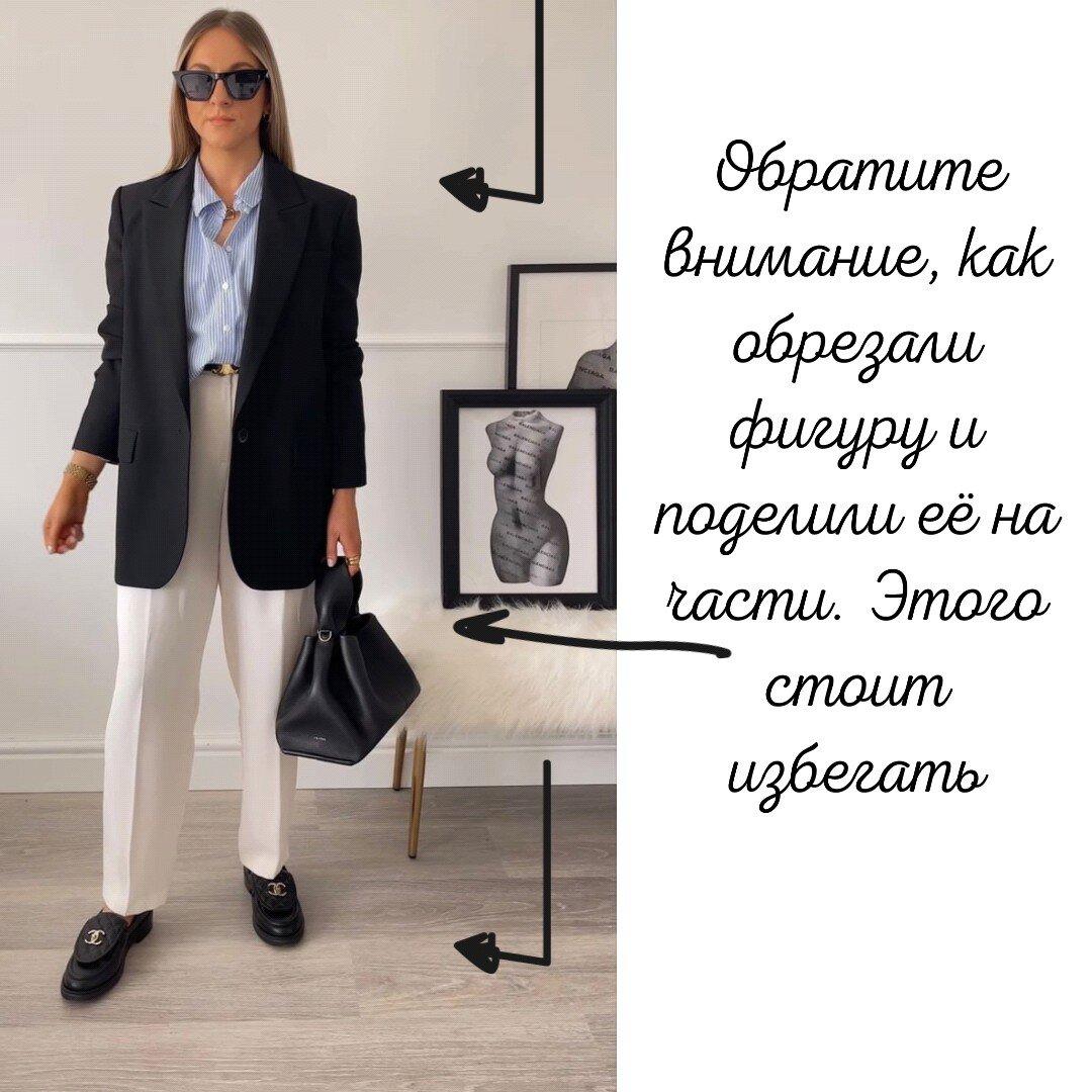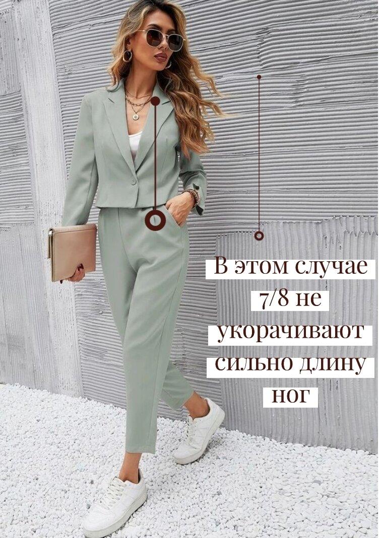 Во-первых, выбирайте брюки с высокой посадкой. Такой стиль создаст визуально более длинные ноги и сделает фигуру более пропорциональной. Если цель сохранить длину ног, то укороченный пиджак сыграет полезную роль