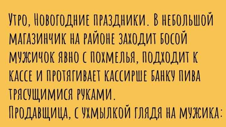 Утро, Новогодние праздники. В небольшой магазинчик на районе заходит босой мужичок явно с похмелья, подходит к кассе и протягивает кассирше банку пива трясущимися руками.