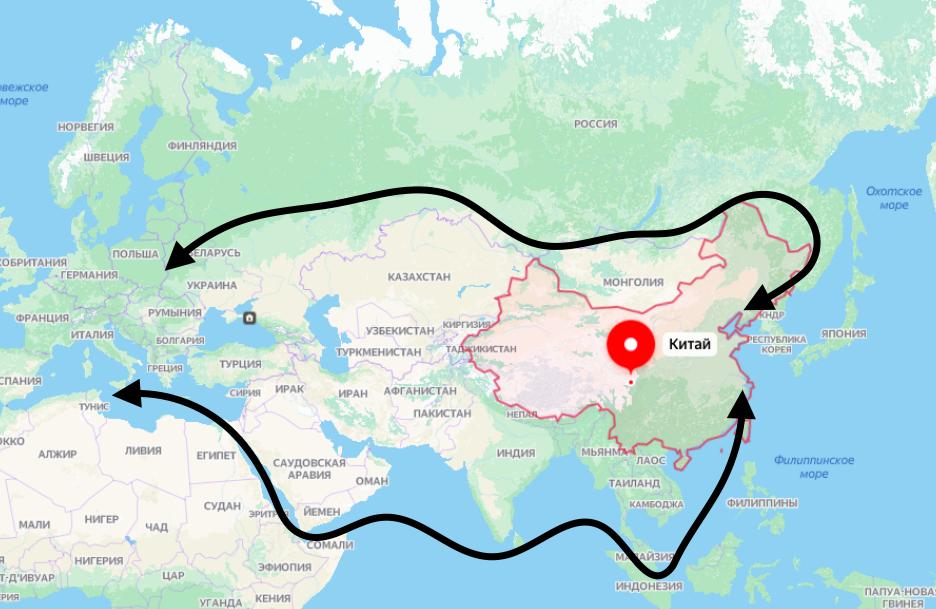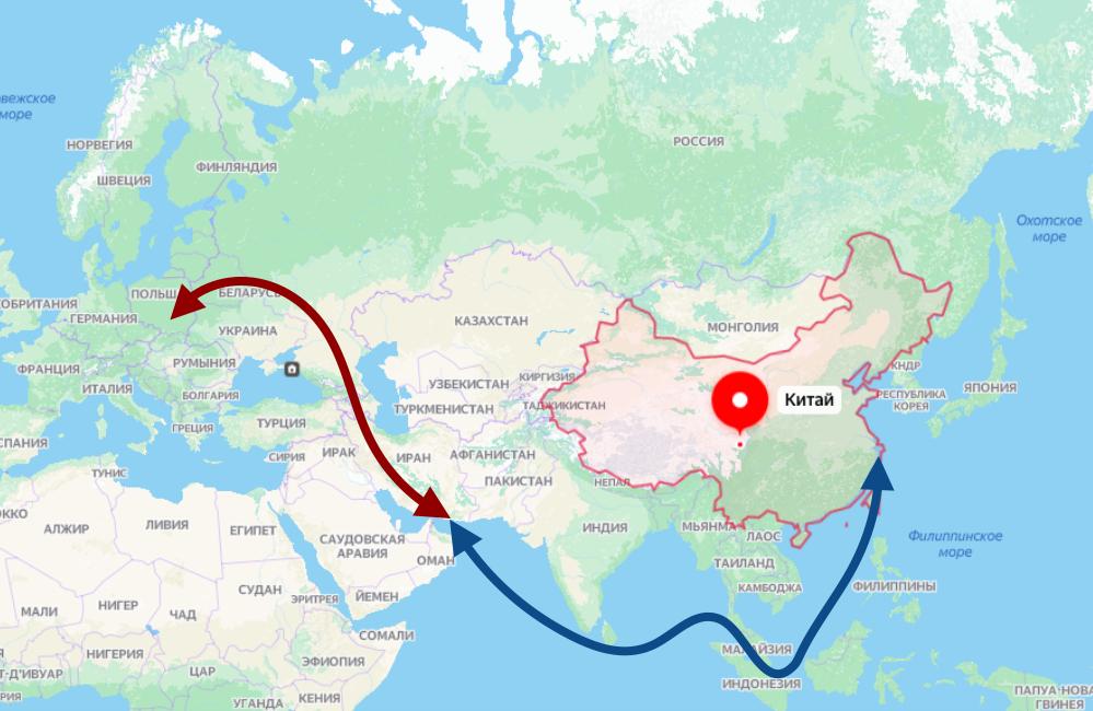 Сейчас товары из него в Европу идут самыми разнообразными путями. От морского через Суэцкий канал, до железнодорожного через Владивосток и Москву: