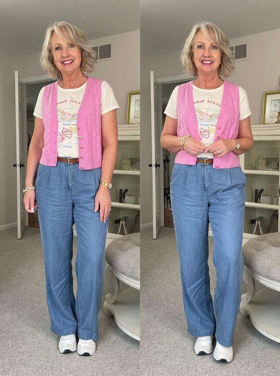 Практичный и привлекательный наряд, прекрасно подходящий для начала осени. Его основу составляют свободно сидящие на фигуре светлые джинсы, светлая футболка с неброским рисунком (можно использовать однотонную или с надписью) и короткая вязаная жилетка розового оттенка. Рекомендуемая обувь – белые кроссовки на небольшой платформе. Подчеркнуть линию талию можно с помощью тонкого ремня.